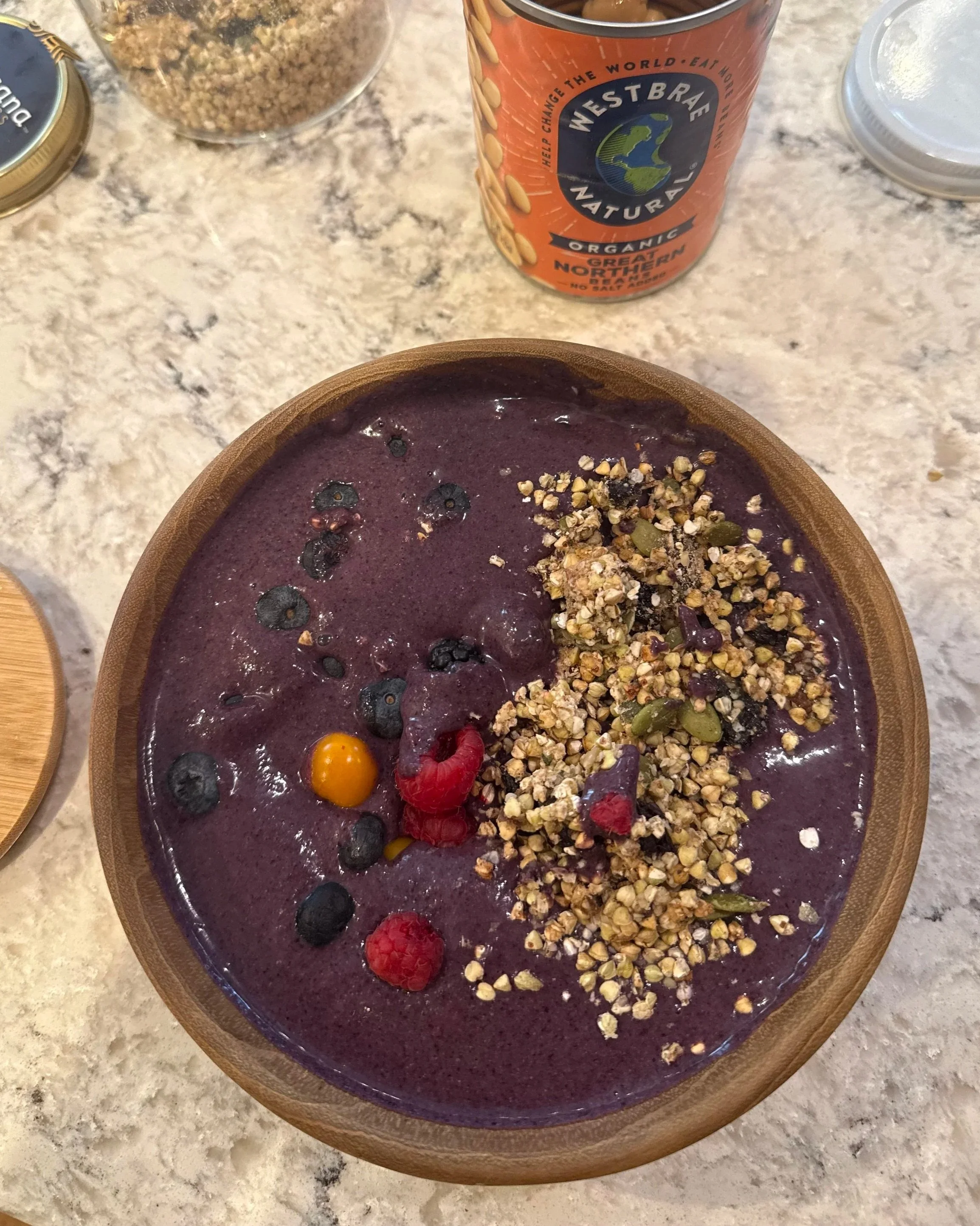 I reworked my staple smoothie bowl recipe, and blended up my beans with homemade almond milk, frozen wild blueberries, frozen cherries, almond butter, chia seeds, and a little kale (because why not).